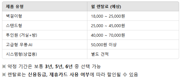 렌탈료는 제품 종류, 약정 기간, 브랜드에 따라 다릅니다.