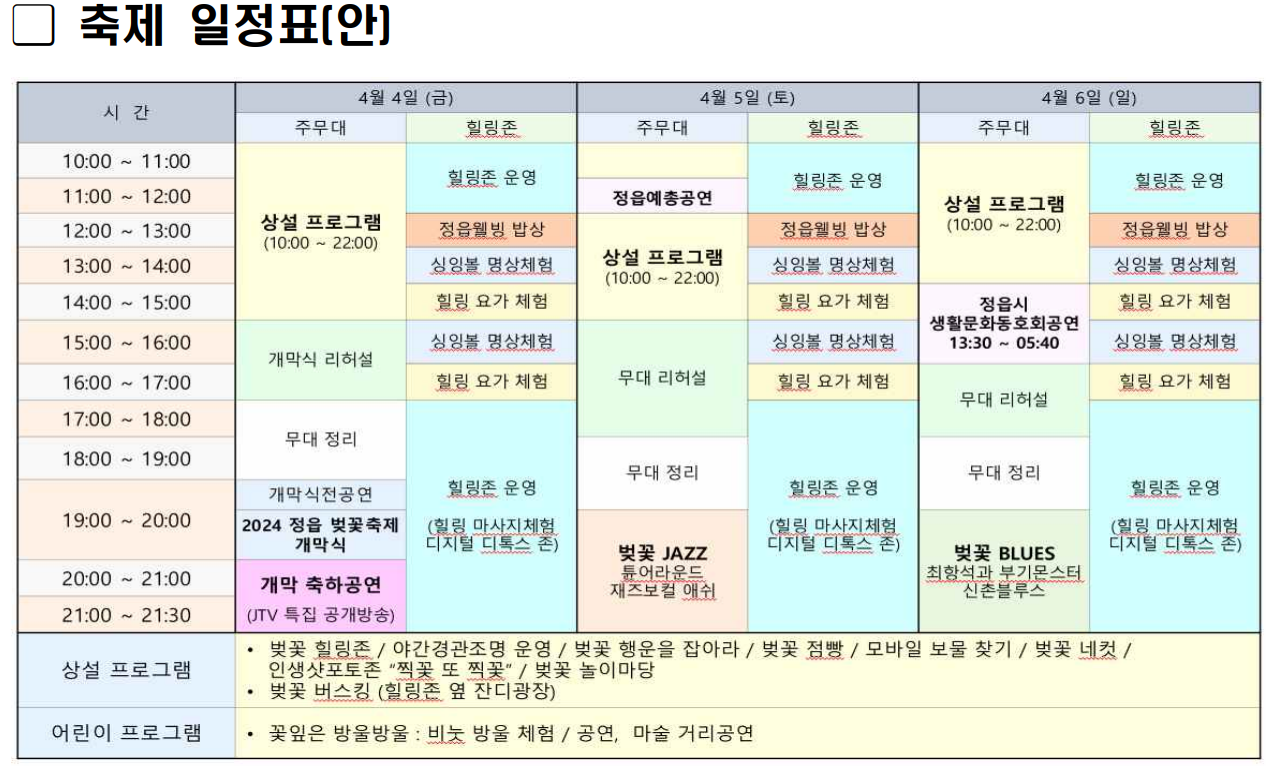 - 주요 행사: 개막식 및 축하공연, 벚꽃 버스킹, 벚꽃 재즈 공연, 힐링 체험 프로그램